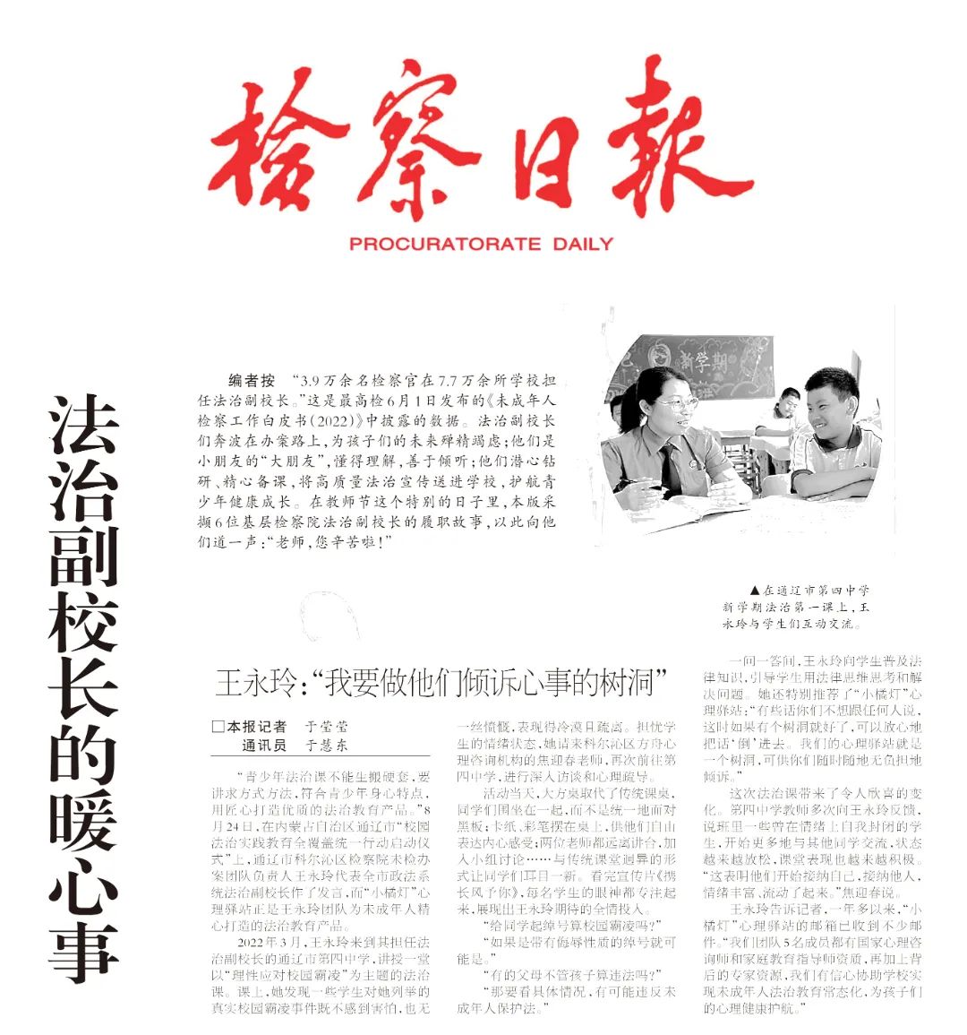 “3.9万余名检察官在7.7万余所学校担任法治副校长。”这是最高检6月1日发布的《未成年人检察工作白皮书(2022)》中披露的数据。法治副校长们奔波在办案路上,为孩子们的未来殚精竭虑;他们是小朋友的“大朋友”,懂得理解,善于倾听;他们潜心钻研、精心备课,将高质量法治宣传送进学校,护航青少年健康成长。在教师节这个特别的日子里,本版采撷6位基层检察院法治副校长的履职故事,以此向他们道一声:“老师,您辛苦啦!”