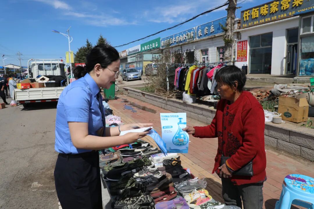 在大北沟镇集市,检察人员手持海报,主动走向赶集的村民向其讲解海报内容,普及节水知识。深入剖析水资源短缺对农业生产和农村生活的潜在影响,强调每个村民在节水行动中的责任与义务,引导村民树立正确的节水观念。