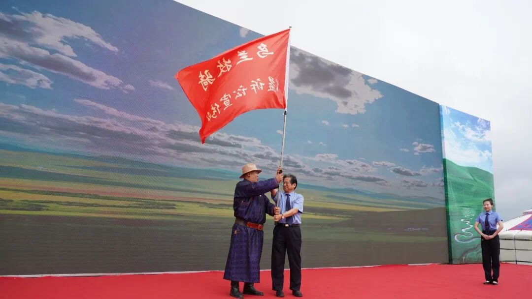 内蒙古自治区人民检察院党组书记、检察长李永君将乌兰牧骑公益诉讼宣传队队旗交给全国第一支乌兰牧骑苏尼特右旗乌兰牧骑队长扎那。