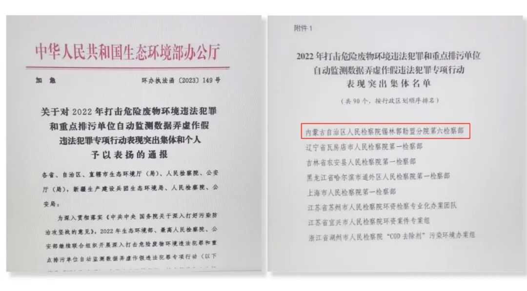 生态环境保护工作不会一蹴而就、一劳永逸,需要我们立足长远、久久为功。锡林郭勒盟检察分院自2018年开始,结合助力打赢浑善达克沙地歼灭战、草原休禁牧监管、湿地保护修复、野生动植物资源保护等中心工作和重点任务,先后制定出台了锡林郭勒盟检察机关保护锡林郭勒大草原的“两个五年规划”(2018-2028),为推动筑牢生态安全屏障接续发力、纵深推进。2023年以来,全盟检察机关共办理各类生态环境和资源保护案件421件,两级院所办理的3件案件被最高人民检察院评为典型案例,4件案件被自治区检察院评为典型案例,草原保护公益诉讼工作入选“2023年度全区首届法治为民创新案例”,1个集体分别获国家级和自治区级表彰奖励,切实做到以法治手段把生态红线划得实、底线守得牢。