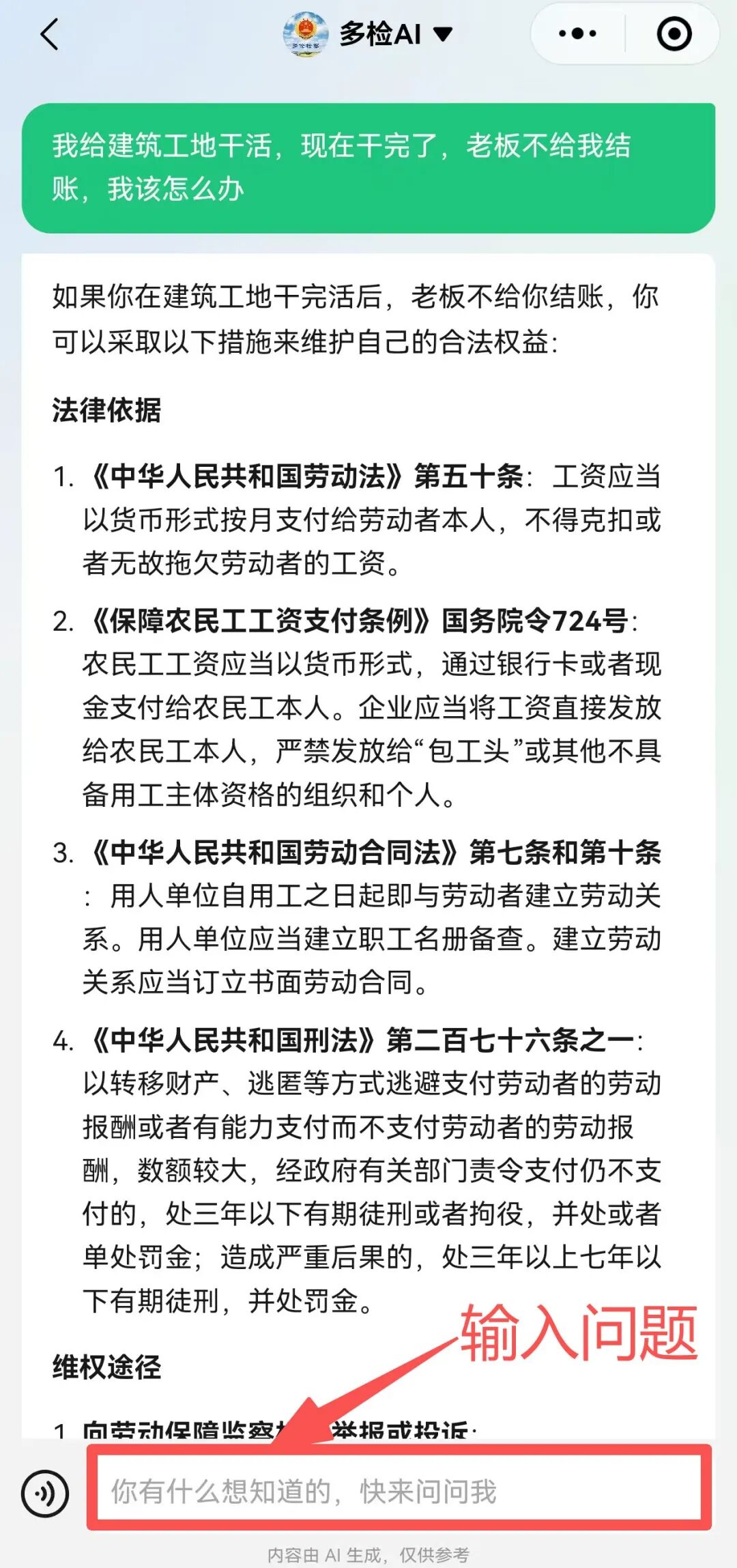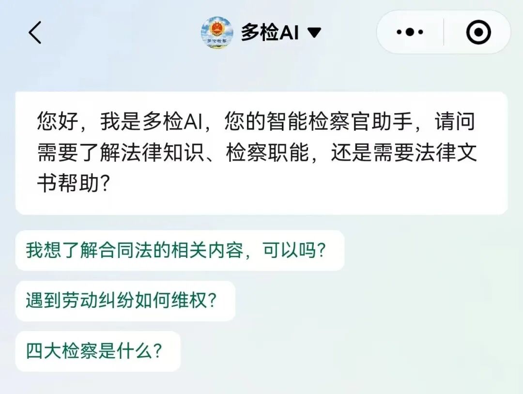 “多检AI”作为新上岗的“见习检察官”,还在学习和进步中。如果在使用过程中,您发现我的回答不够精准、对最新法条理解有延迟、或者对复杂案情难以深入解析,甚至是操作时有点卡顿、响应不够快,都请您多多包涵。我们热切欢迎您随时通过公众号后台,将意见或建议反馈给我们!您的每一句点评,都是我们成长的阶梯,我们将不断优化模型、更新知识库,致力于成为您更智慧、更贴心的法律生活助手。科技赋能检察,服务永不下线。“多检AI”是我院探索“检察+AI”的积极尝试,未来,还将持续开发更多实用功能,努力让智慧检察服务覆盖更多元的法治场景。
