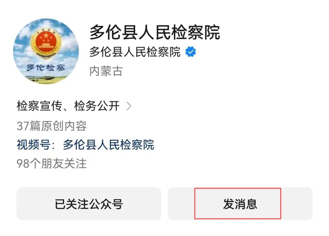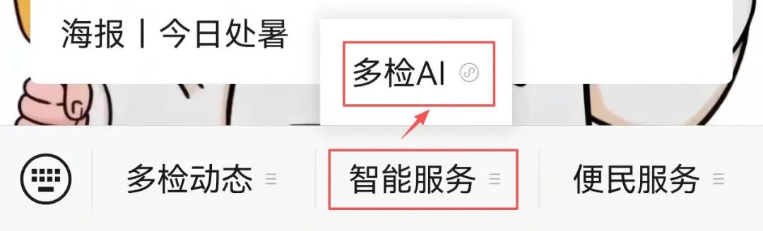 如何找到“多检AI”?很简单! 打开微信,关注“多伦县人民检察院”微信公众号,点击底部菜单栏的【智能服务】,选择【多检AI】即可与我对话,操作简便易上手。“多检AI”同步部署至公众号后台,也可以通过发私信的方式与我交流。